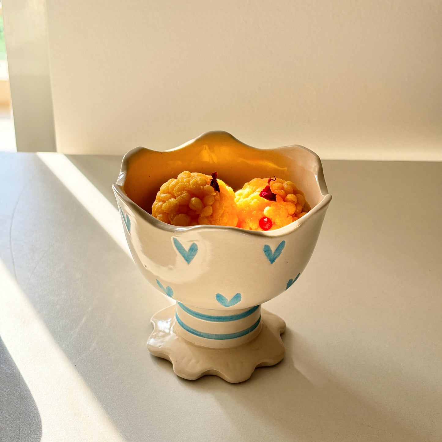 Bring a touch of charm to your table with the Blue Hearts Dessert Mug, where the blue hearts symbolize the color of Krishna, representing love and divine joy. Adorned with a delightful heart pattern, this mug is designed to bring positivity and happiness into your life. Perfect for desserts, beverages, or as a thoughtful gift